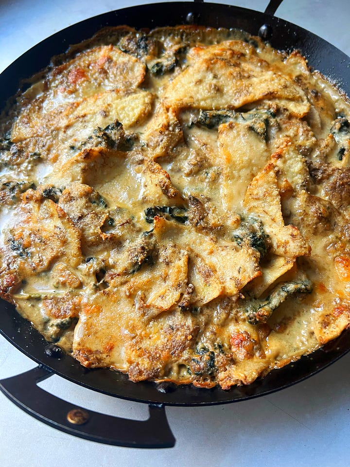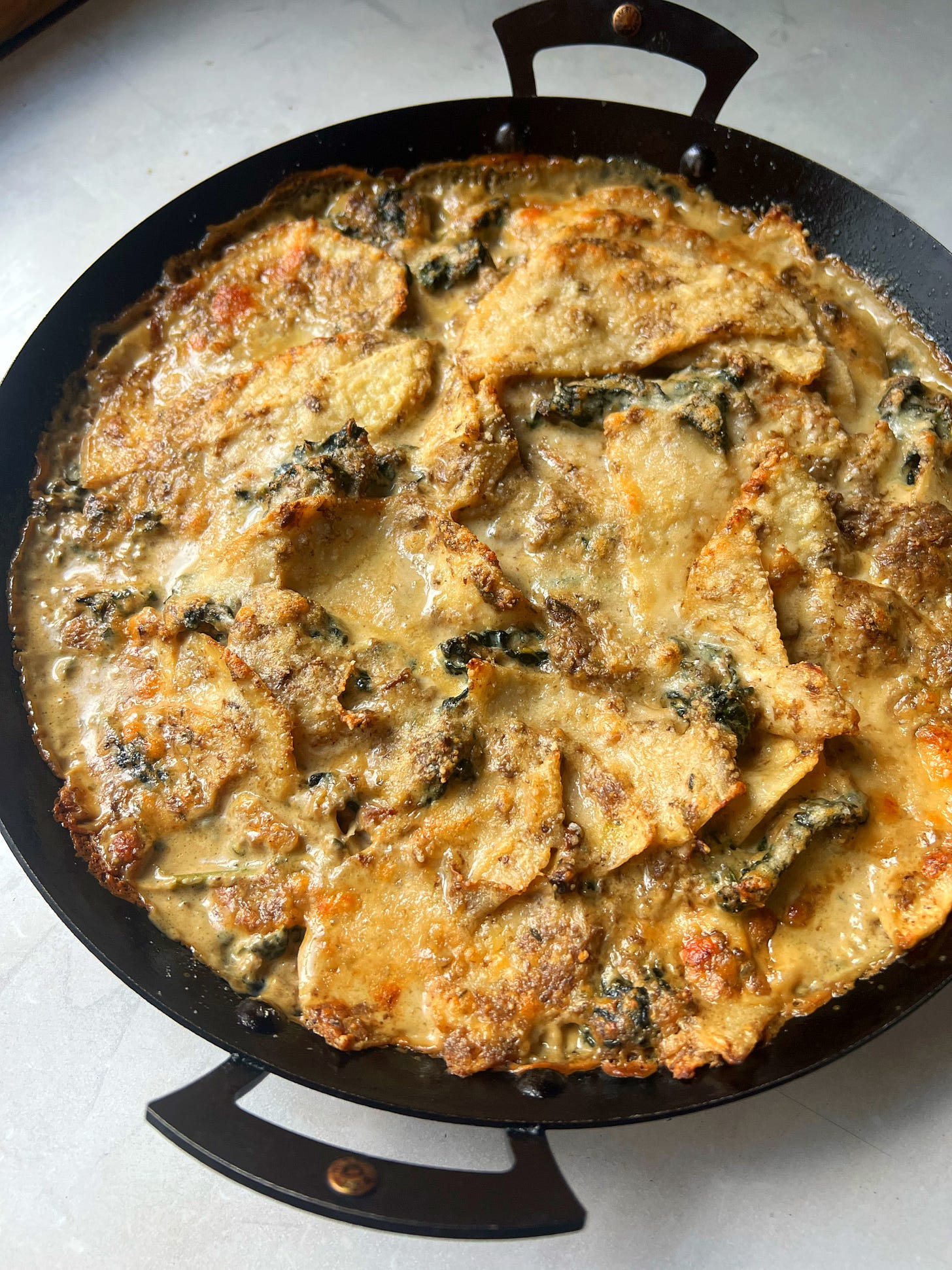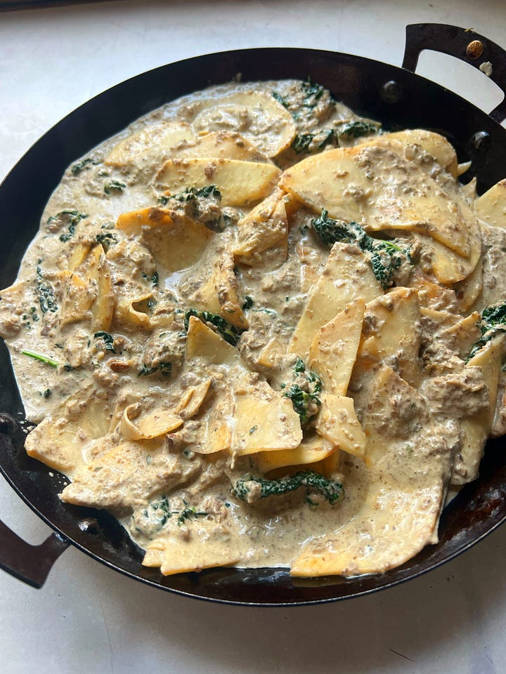 4. Add the milk, cream, dried porcini and celeriac to the pan. Bring to a gentle simmer then add the cavolo nero. Cook until the celeriac is just tender (around 10 more minutes). The liquid should be a thick coating consistency at this point. If it’s too loose continue to cook until it thickens, if it becomes very stodgy add a small splash of water