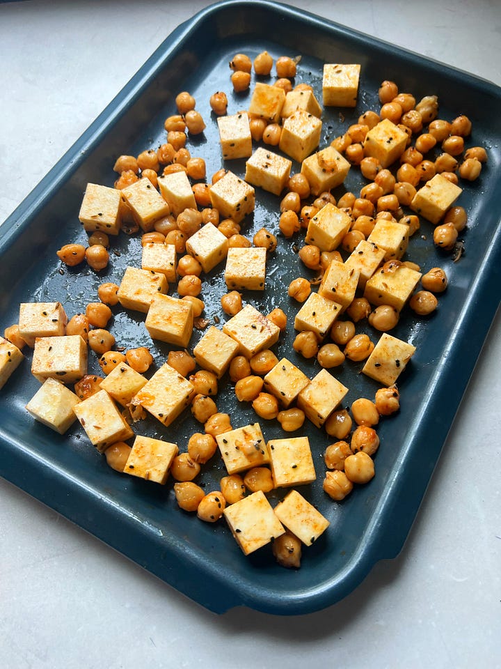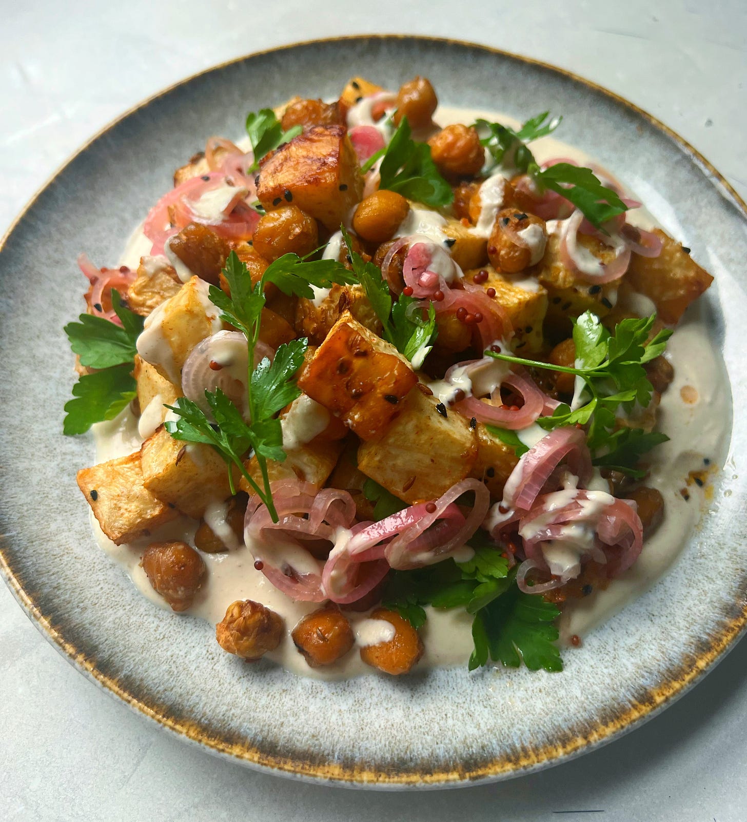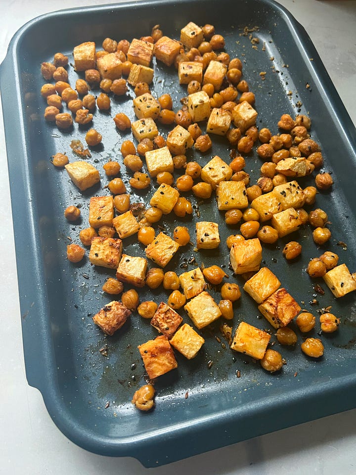 Preheat oven to 190c / 375F fan. Mix together the celeriac, chickpeas, nigella, cumin, chilli powder, cinnamon, olive oil and salt. Transfer to a metal baking sheet and roast until golden (around 20 minutes). NOTE: chickpeas can sometimes pop and jump about in the oven, you could either prick the chickpeas or cover with another metal baking sheet to avoid this