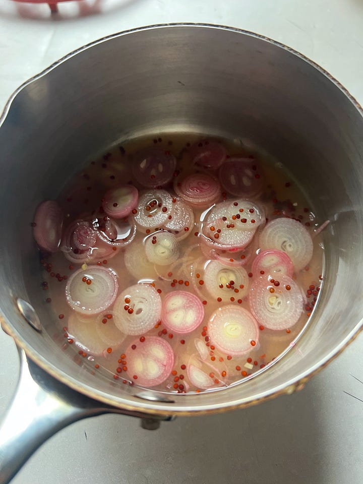 Place the vinegar (or lemon) in a small saucepan with the mustard seeds and shallot. Bring to a simmer then set the pan aside until needed