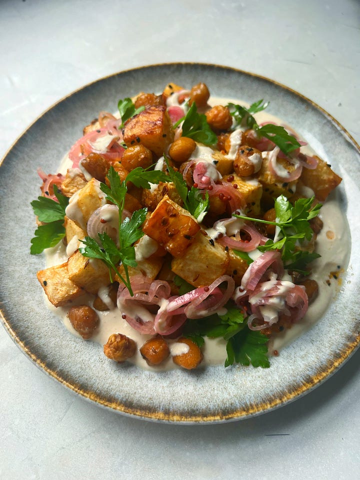 Spoon most of the dressing onto a serving plate, top with the celeriac chickpea mixture, drained shallots, parsley and drizzle over the remaining dressing